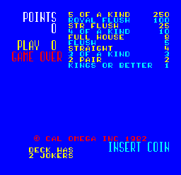 Draw Poker con 2 Jolly in ogni mazzo piú l'eccitante Double Up. Il giocatore puó scartare fino a 5 carte per mano. Quando il giocatore ha una mano vincente, ha due possibilitá. Puó tenere la sua vincita con il pulsante "Take" o provare a raddoppiarla con il pulsante "Double". Se sceglie "Double", appaiono due ulteriori possibilitá, "Big" o "Small". Se viene scelto "Big", la carta che appare successivamente deve essere piú alta di "8". Se compare un jolly, e' una vincita automatica. Vincere raddoppia i punti abilitá del giocatore.