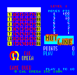 History.dat Hotline (c) 1984 Cal Omega. Hotline é un gioco di abilita' nel quale il giocatore deve allineare 7 numeri orizzontalmente o diagonalmente. Per vincere, il gioco deve essere completato con il numero minore di mosse possibili per ottenere il punteggio piú elevato. - FONTI - Game's ROM. |
