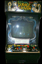 Dietro al vetro anteriore del cabinato c'e' una decorazione in cartone che circonda il video includendo le istruzioni per il gioco. La struttura del cartone e' solitamente a due lati. C'e' il logo della TAITO da un lato e dall'altro quello di Double Dragon. Il marquee e il pannello di controllo sono caratterizzati da un drago e delle immagini di Jimmy e Billy Lee. Il pannello di controllo include i loro nomi. La maggior parte dei cabinati utilizzano i tasti blu per il giocatore uno ed i tasti rossi per il giocatore due, ma un cabinato di media dimensione utilizza i tasti gialli per entrambi i giocatori ed usa un vetro piu' spesso con le protezioni di plastica bianca lungo i bordi esterni. Di lato si vede il nome TAITO nella parte superiore a modello di Y con delle linee rosse, bianche, grigie e nere. Il primo cabinato di Double Dragon ha avuto una combinazione differente di colore per il logo sul lato. La parte nera del logo laterale era arancione e la parte grigia era gialla. Il cabinato utilizza un cassetto chiudibile a chiave nella parte inferiore contenente il gruppo di alimentazione e la scheda del gioco.
