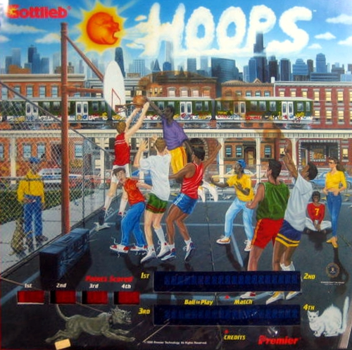 Hoops fu l'ultimo gioco "street level" (a livello della strada) di Gottlieb. I giochi "street level" furono un esperimento di Gottlieb volto a progettare giochi piu' semplici, a singolo livello (niente rampe), un po' piu' piccoli e meno costosi. Non vendettero molto bene e furono prodotti solo sei modelli ("Silver Slugger", "Vegas", "Deadly Weapon", "Title Fight", "Car Hop" e Hoops).