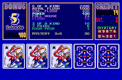 History.dat Magic Card II (c) 1996 Impera. - DATI TECNICI - Processore Principale : M65C02 (@ 2 Mhz) Chip Audio : AY8910 (@ 2 Mhz) Orientamento dello schermo : Orizzontale Risoluzione video : 392 x 295 pixels Frequenza aggiornamento video : 50.00 Hz Colori palette : 512 Giocatori : 1 Pulsanti : 7 - FONTI - Game's ROM. |