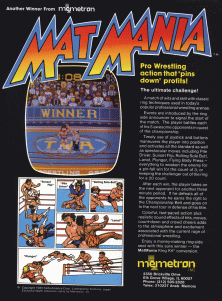 Un incontro di ingegno e abilitá con le classiche tecniche di lotta utilizzate oggi nelle arene del popolare wrestling professionale. L'annunciatore a bordo ring segnala l'inizio dell'incontro introducendo l'evento. Il giocatore combatte ognuno dei suoi 5 magnifici avversari alla ricerca del titolo mondiale. L'utilizzo puntuale di joystick e pulsanti manvora il giocatore e attiva tutte le mosse standard come quelle spettacolari, inclusi: Pile Driver, Sunset Flip, Rolling Sole Butt, Lariat, Plunger, Flying Body Press, tutto per indebolire il nemico per vincere schienandolo con un conto di 3 o tenendolo fuori dal ring per un conto di 20. Dopo ogni vittoria, il giocatore affronta l'avversario successivo in un altro incontro di 3 minuti. Se sconfigge tutti gli avversari, guadagna la cintura da campione e affronta altri quattro incontri di difesa del suo titolo. Azione colorata e veloce piú effetti sonori realistici dei colpi, delle mosse, dei conteggi e delle reazioni del pubblico sono un valore aggiunto all'atmosfera ed eccitazione associati all'attuale popolaritá del wrestling professionale. Godi di un proficuo posto a bordo ring con un sicuro vincitore, il kit di conversione di Mat Mania.
