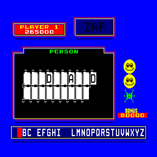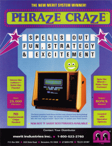 History.dat Phraze Craze (c) 1986 Merit. - DATI TECNICI - Processore Principale : Z80 (@ 2.5 Mhz) Chip Audio : AY8910 (@ 2.5 Mhz) Orientamento dello schermo : Orizzontale Risoluzione video : 512 x 248 pixels Frequenza aggiornamento video : 60.00 Hz Colori palette : 256 Giocatori : 2 Pulsanti : 5 - FONTI - Rom del gioco. |