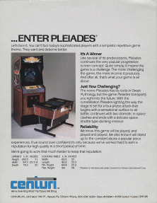 History.dat Pleiads (c) 1981 Centuri, Inc. - CURIOSITA' - Pubblicato nel Luglio 1981 da Centuri negli USA su licenza di Tehkan International Corp. Per maggiori informazioni sul gioco, si veda la scheda dell'originale di Tehkan. - FONTI - See Immagini del cabinato. Game's ROM. |