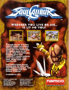 Soul Calibur adottó lo 'stile Tekken' per lo sblocco dei personaggi, con un'enorme squadra nascosta che venica sbloccata lasciando il gioco acceso per mesi... E' comunemente noto che puoi misurare l'etá di un picchiaduro moderno di Namco contando i personaggi e questo é uno di due soli giochi da sala che potevi misurare ancora dopo un anno (l'altro é "Tekken Tag Tournament").