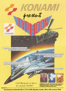 Prendi il controllo di un potente elicottero e fai esplodere fortezze nemiche in questo superbo sparatutto dai bravi ragazzi della Konami. Typhoon e' caratterizzato da una grafica impressionante piena di effetti di scalatura e di rotazione (anche se alcuni possono essere un po' disorientanti !), una colonna sonora solida e un controllo eccellente del gioco. Altamente suggerito per qualsiasi entusiasta dello sparattutto!